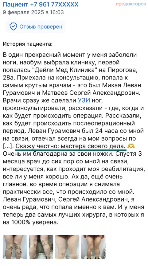 В клинике Daily Med Clinic используем самые современные лазерные методики, нет госпитализации, разрезов и реабилитации! Все процедуры проходят под местным обезболиванием (по ощущениям несколько уколов), после этого сразу отпускаем домой, через пару дней контрольный осмотр и вперёд в жизнь без рисков тромбоза, полной радости и здоровья!